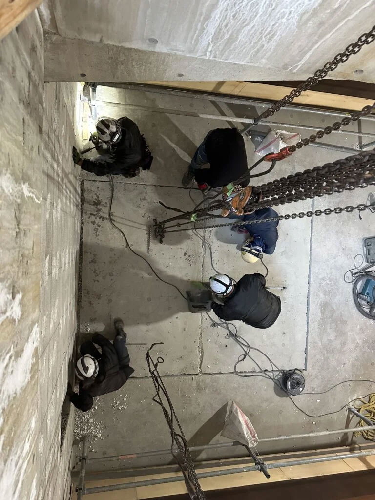 大阪市内(市街地)のビル地下における大型制御操作機および制御盤の搬出入作業に伴う、B1F・B2Fのハッチ蓋の撤去および設置工事についての作業写真です。